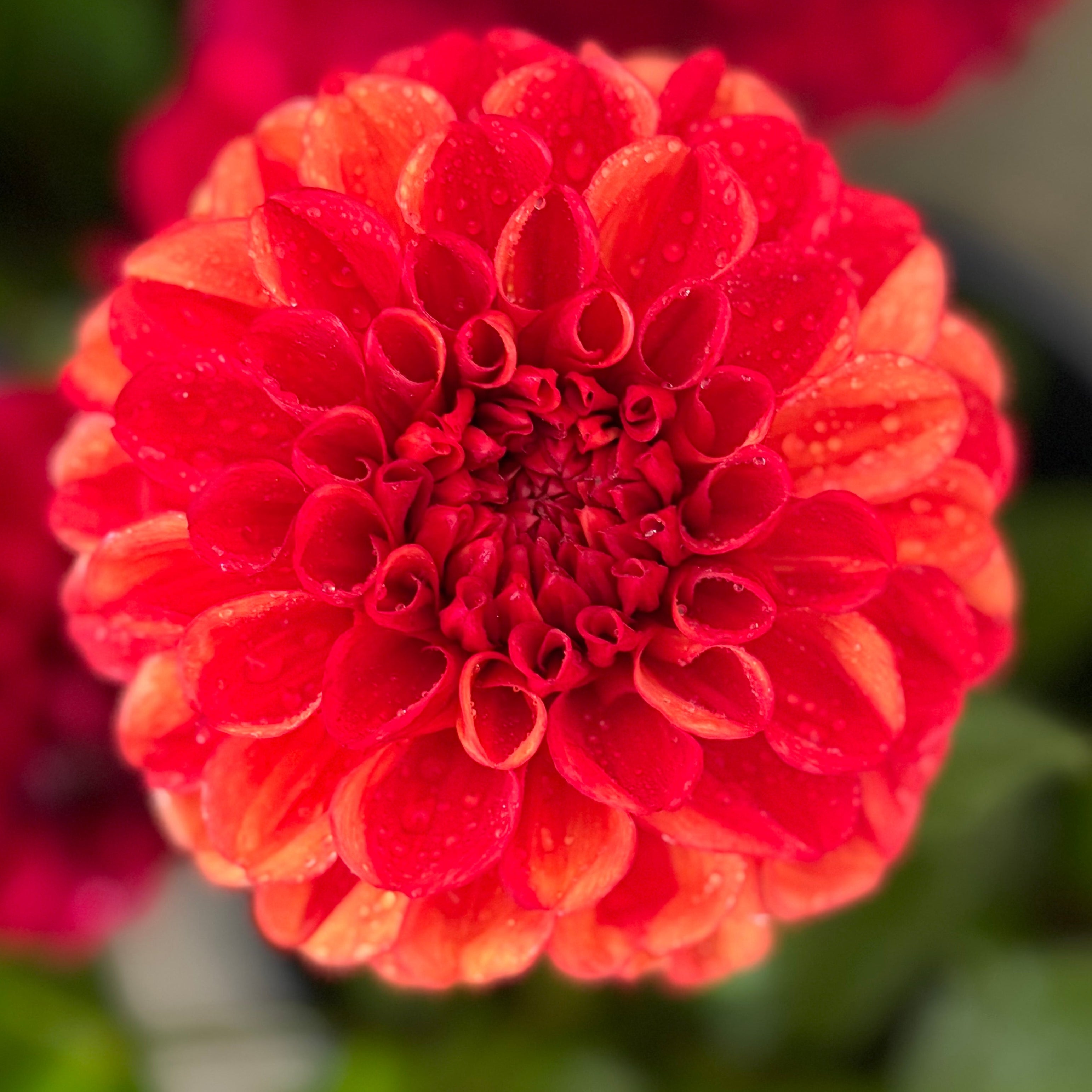 Prachtige twee kleurige Baldahlia's in oranje en donkerrode kleuren die spelen.