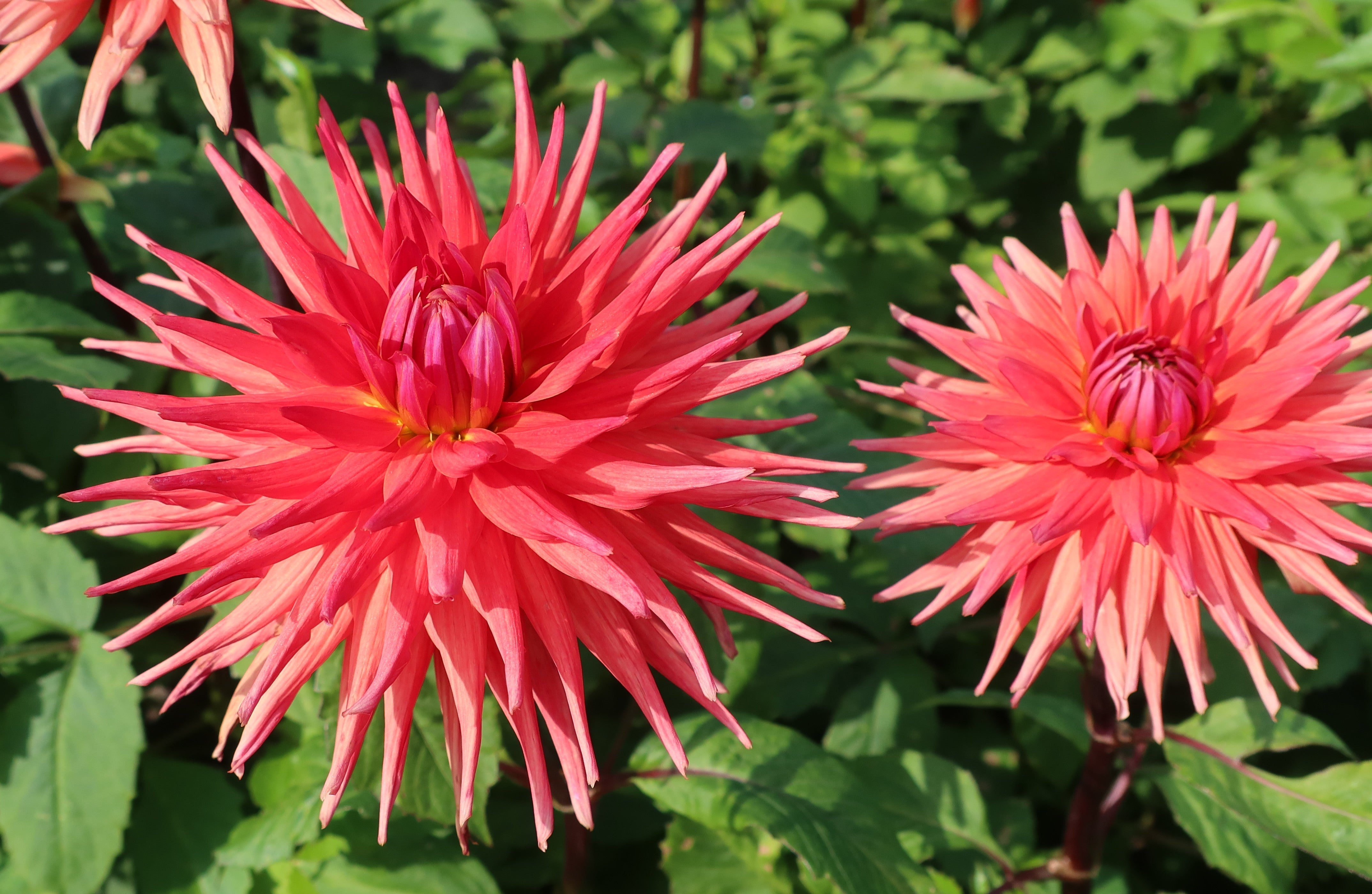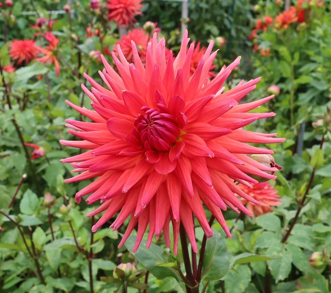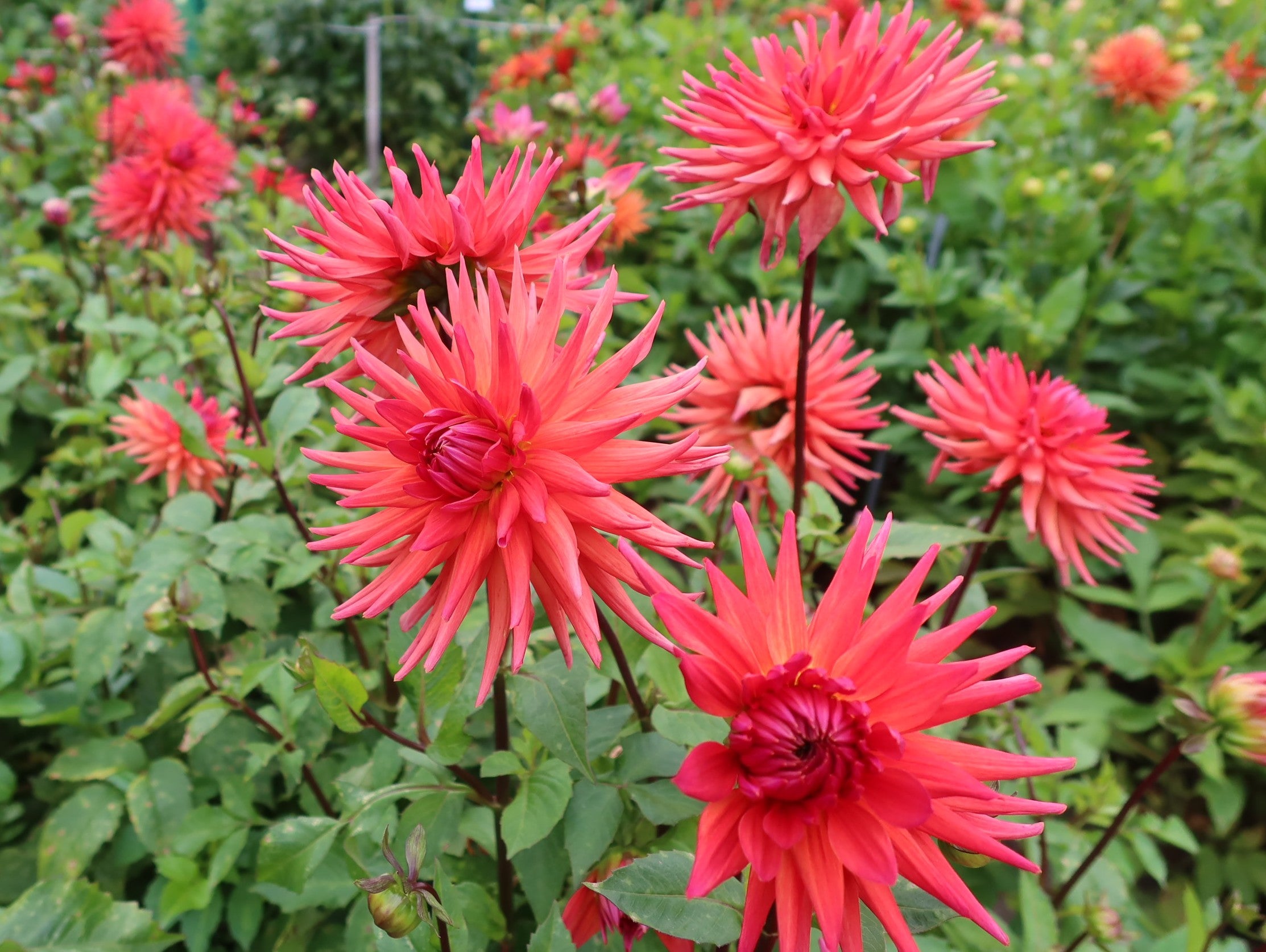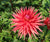 Mooie middelgrote cactusdahlia met een kleurverloop van zalm, koraal en roze.