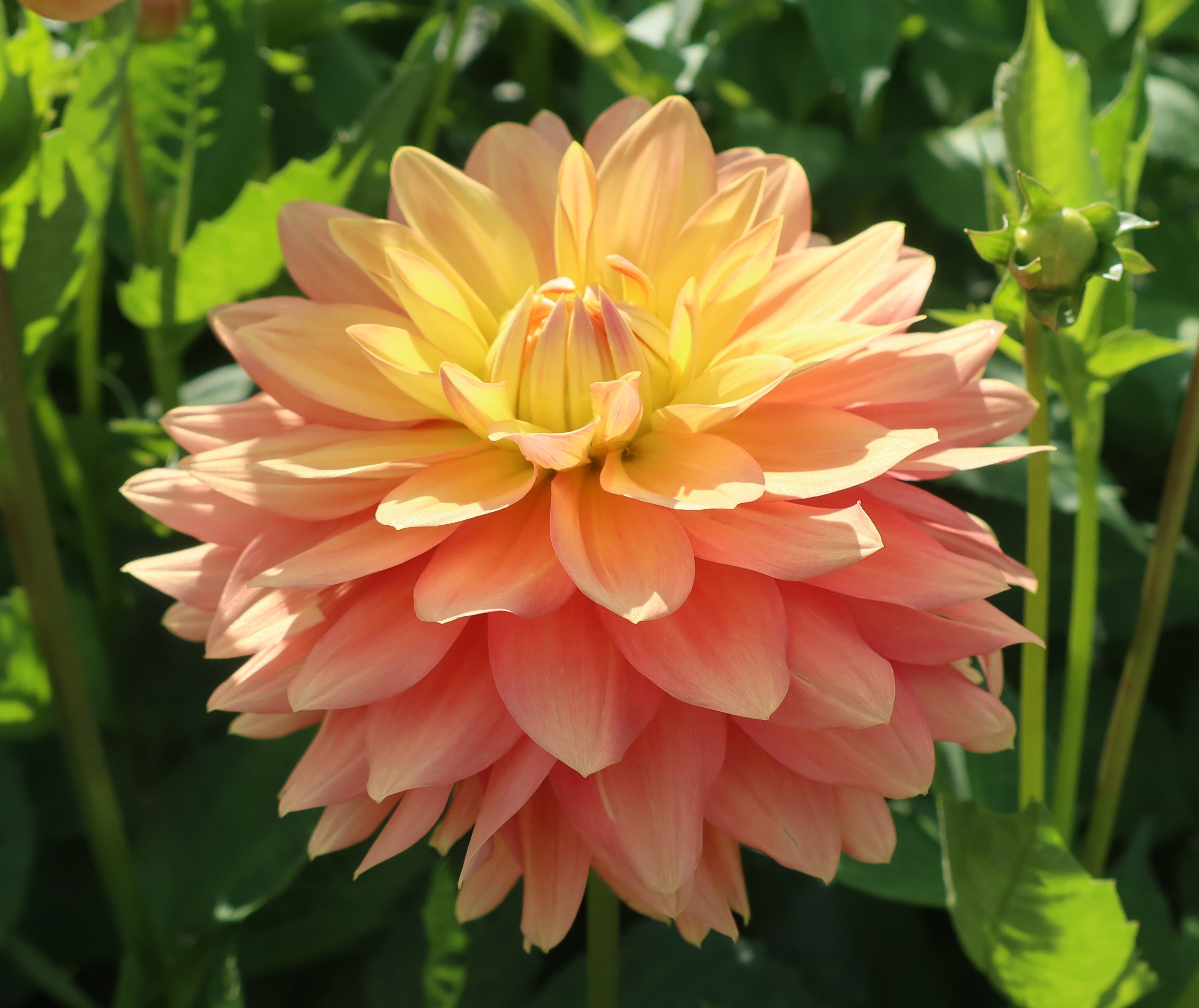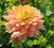 Middelgrote decoratieve dahlia. De bloemen zijn licht zalmroze met zacht geel hart.