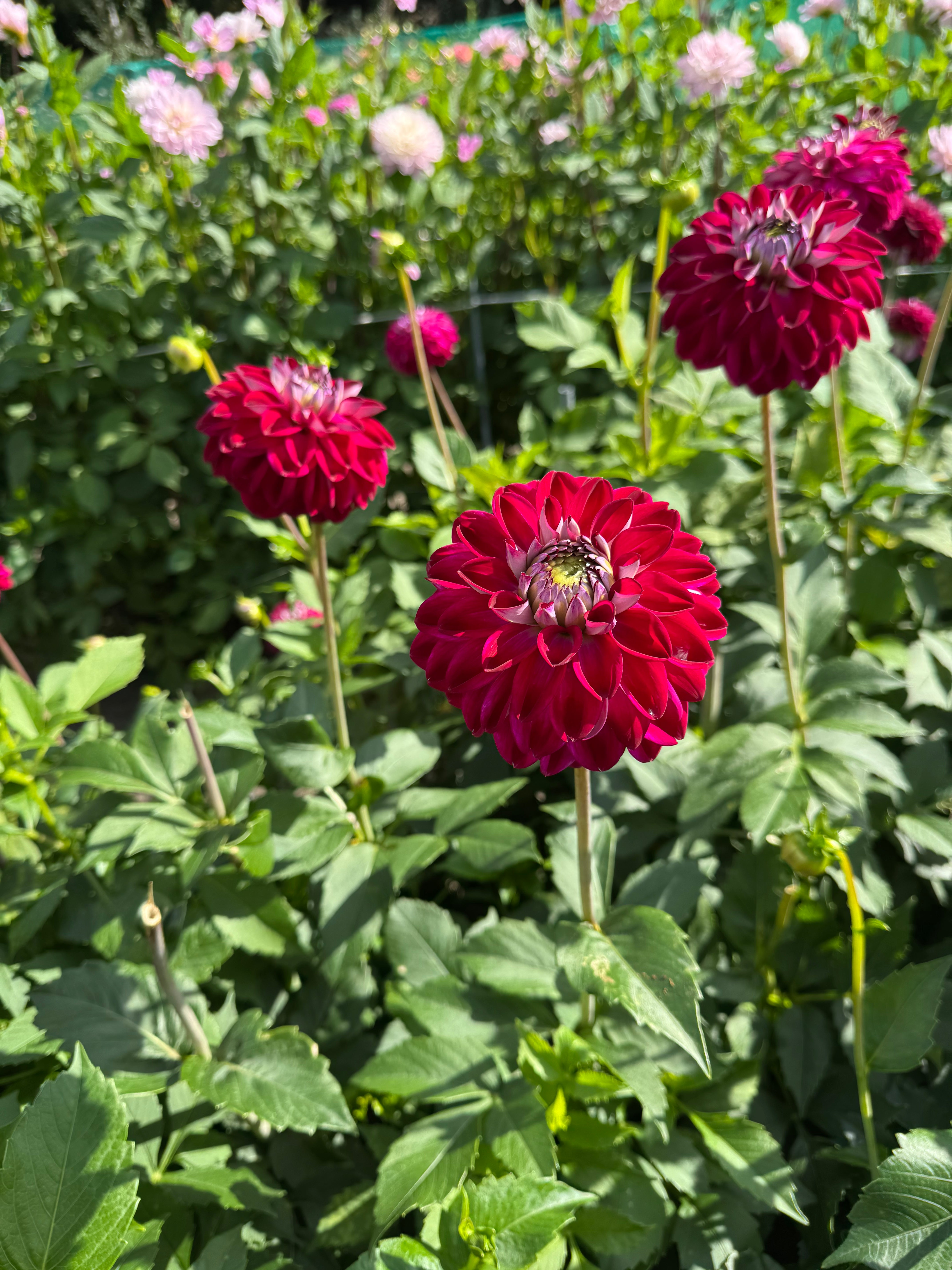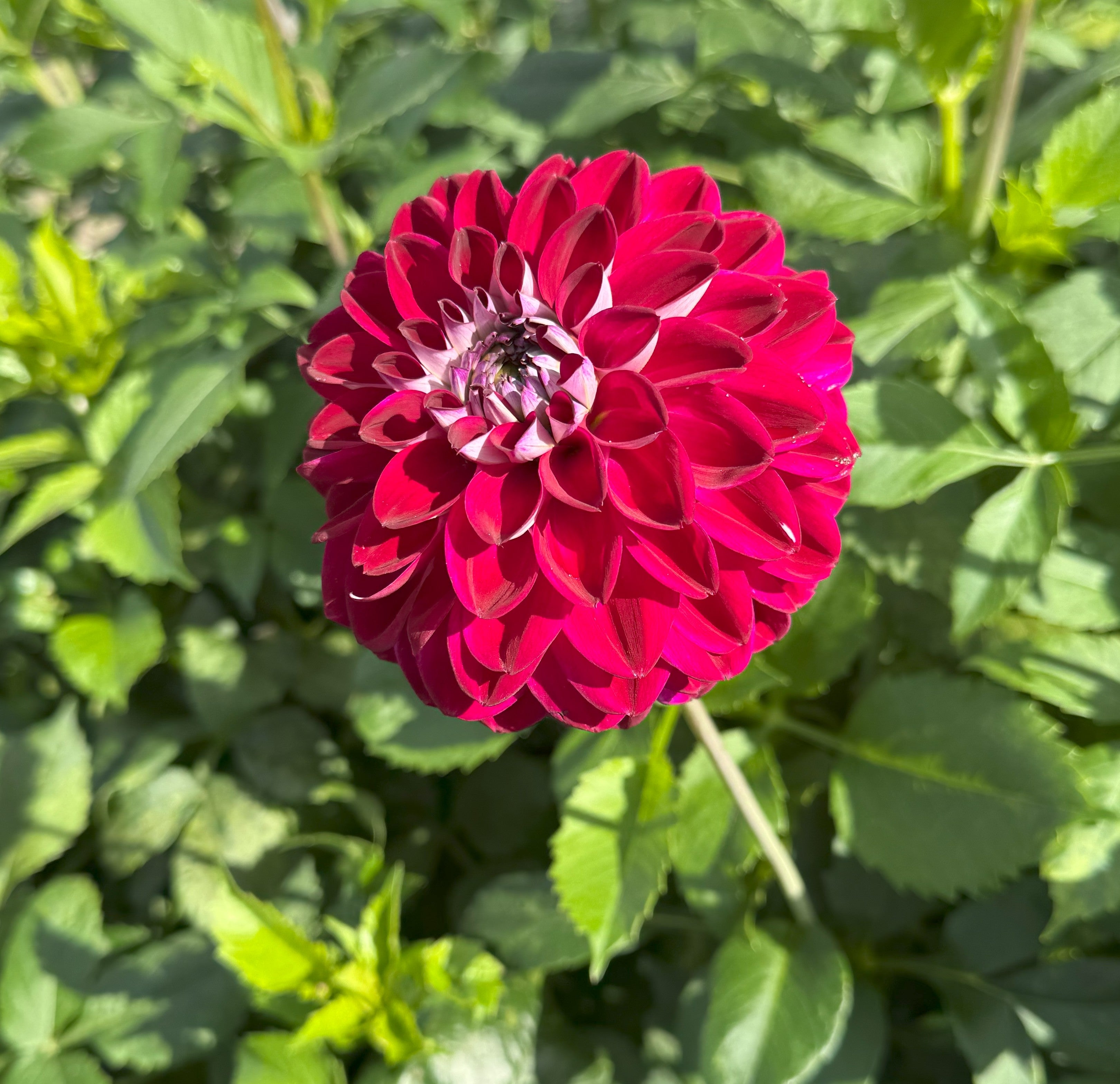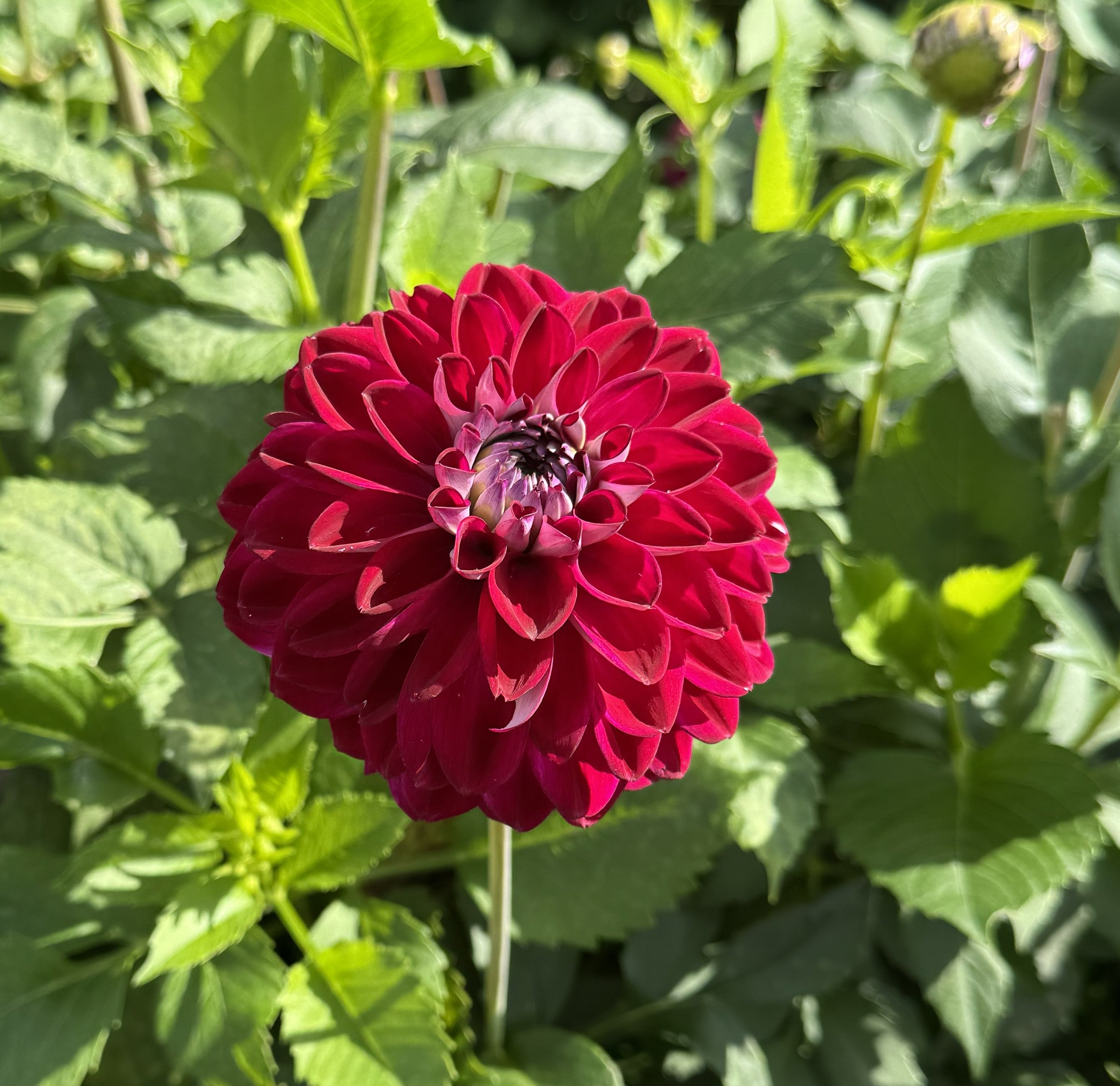 Mooi bolvormige dahlia met donkerpaarse bloemblaadjes die aan de achterkant wil zijn met een soort zilvergrijze gloed erover. Mooi in boeketten.