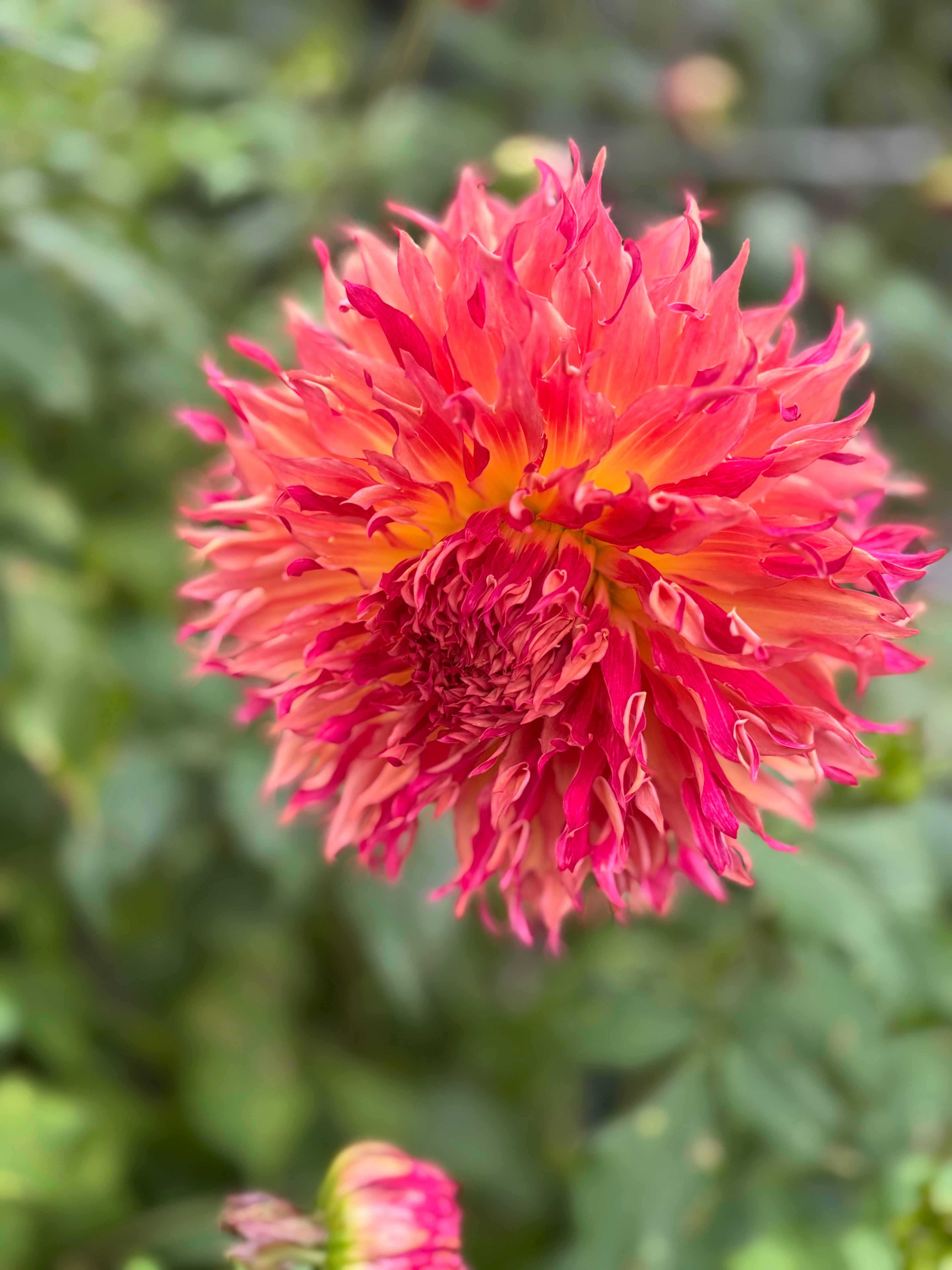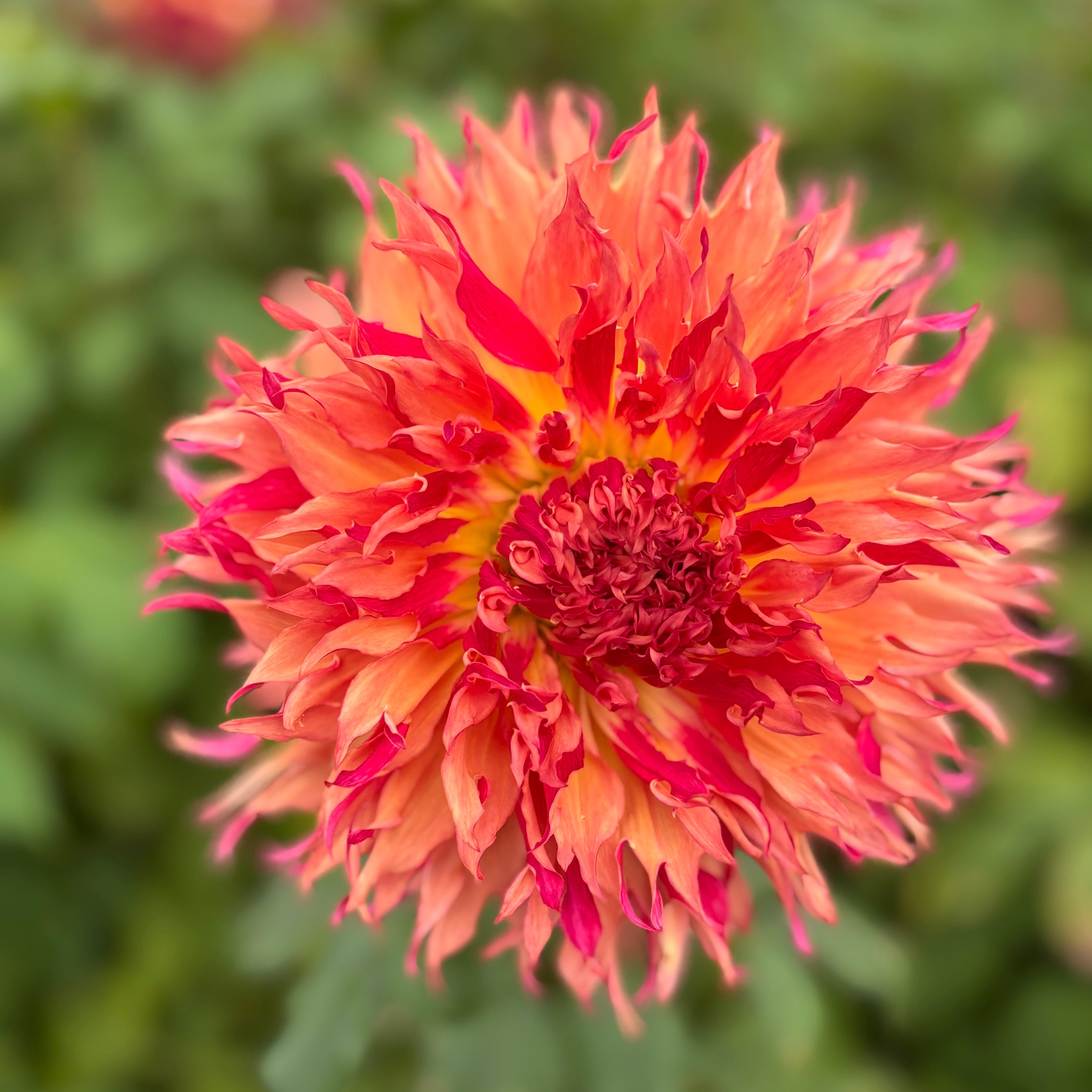 Gezellige gefranjerde dahlia met een prachte schakering van vele kleuren.